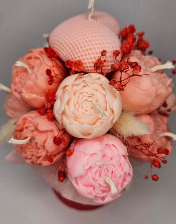 Każdy element tego kompozycyjnego arcydzieła został wykonany ręcznie z naturalnego, ekologicznego wosku sojowego. Utrzymany w odcieniach różu i czerwieni, ozdobiony suszonymi kwiatami i zapakowany w eleganckie pudełko – prezentuje się zjawiskowo i luksusowo. Gotowy do wręczenia bez potrzeby dodatkowego pakowania.